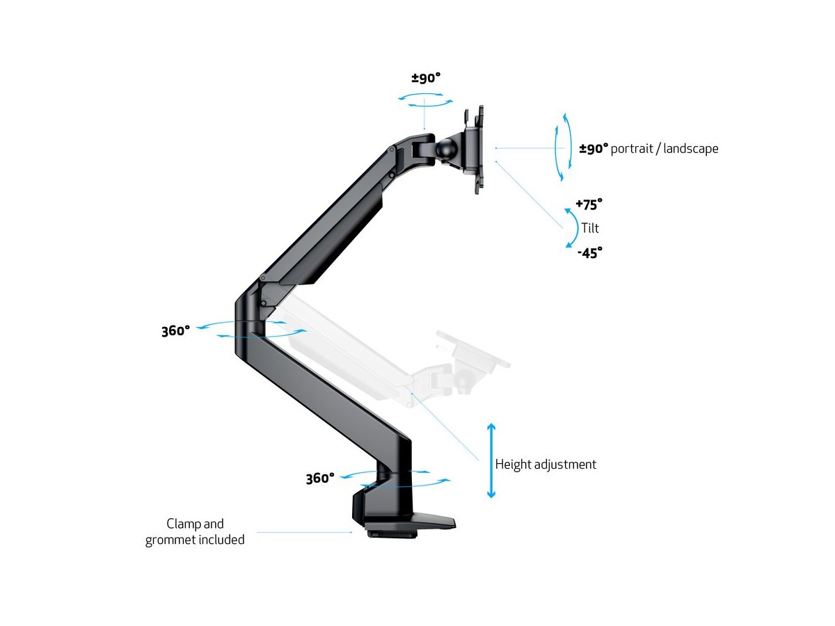The M VESA Gas Lift Arm is made out of a durable aluminum construction and uses a gas driven suspension technique. This makes the screen "float" and it can then be moved with near zero effort. Sleek and streamlined, the M VESA Gas Lift Arm Single frees up space and allows positioning of your display for greater productivity. The unique counterbalance gas technology provides smooth adjustment in any direction. Easy move the screen from landscape to portrait position or move the screen close to the desk, high up, matching almost any wanted working position imaginable.