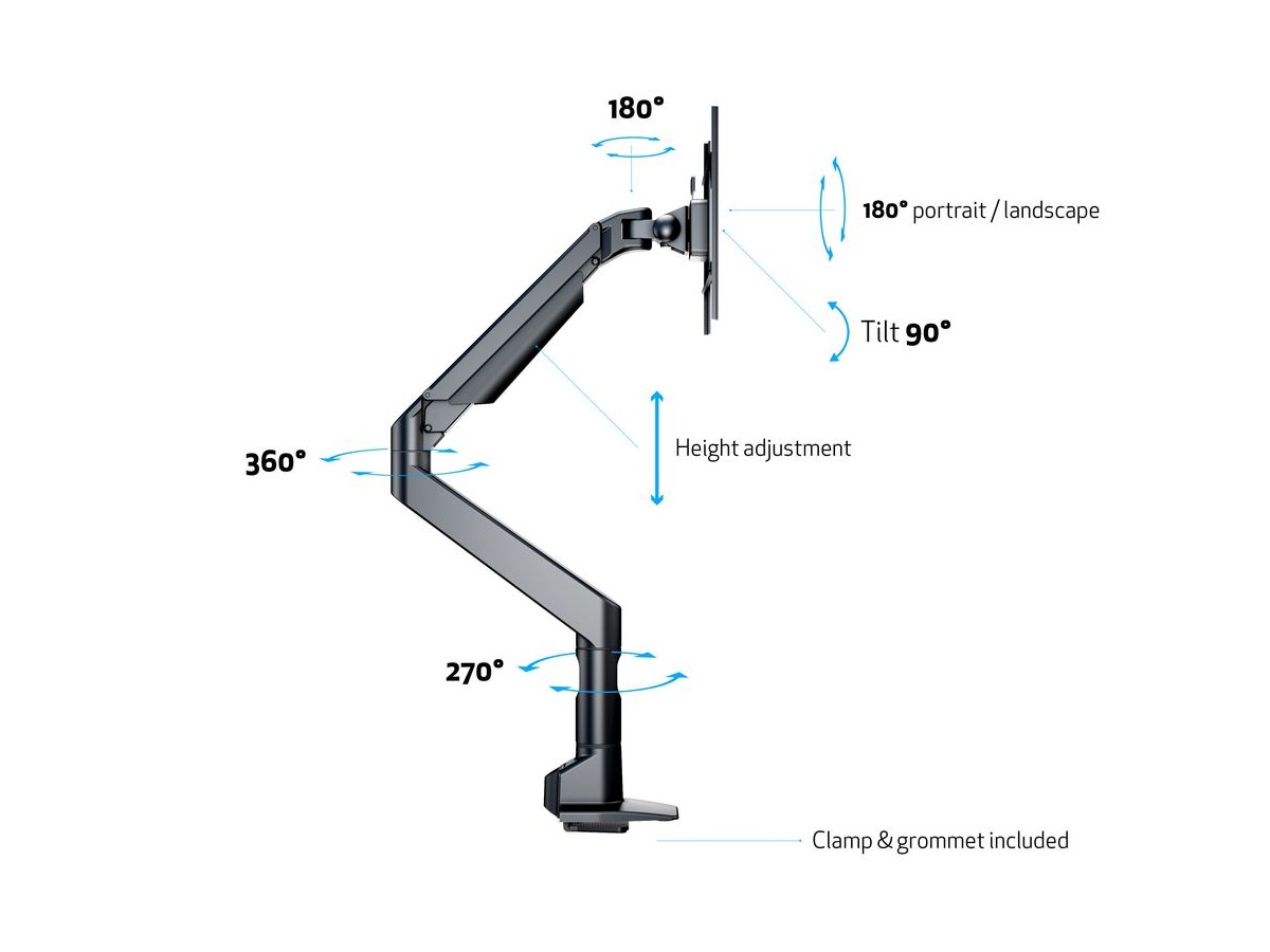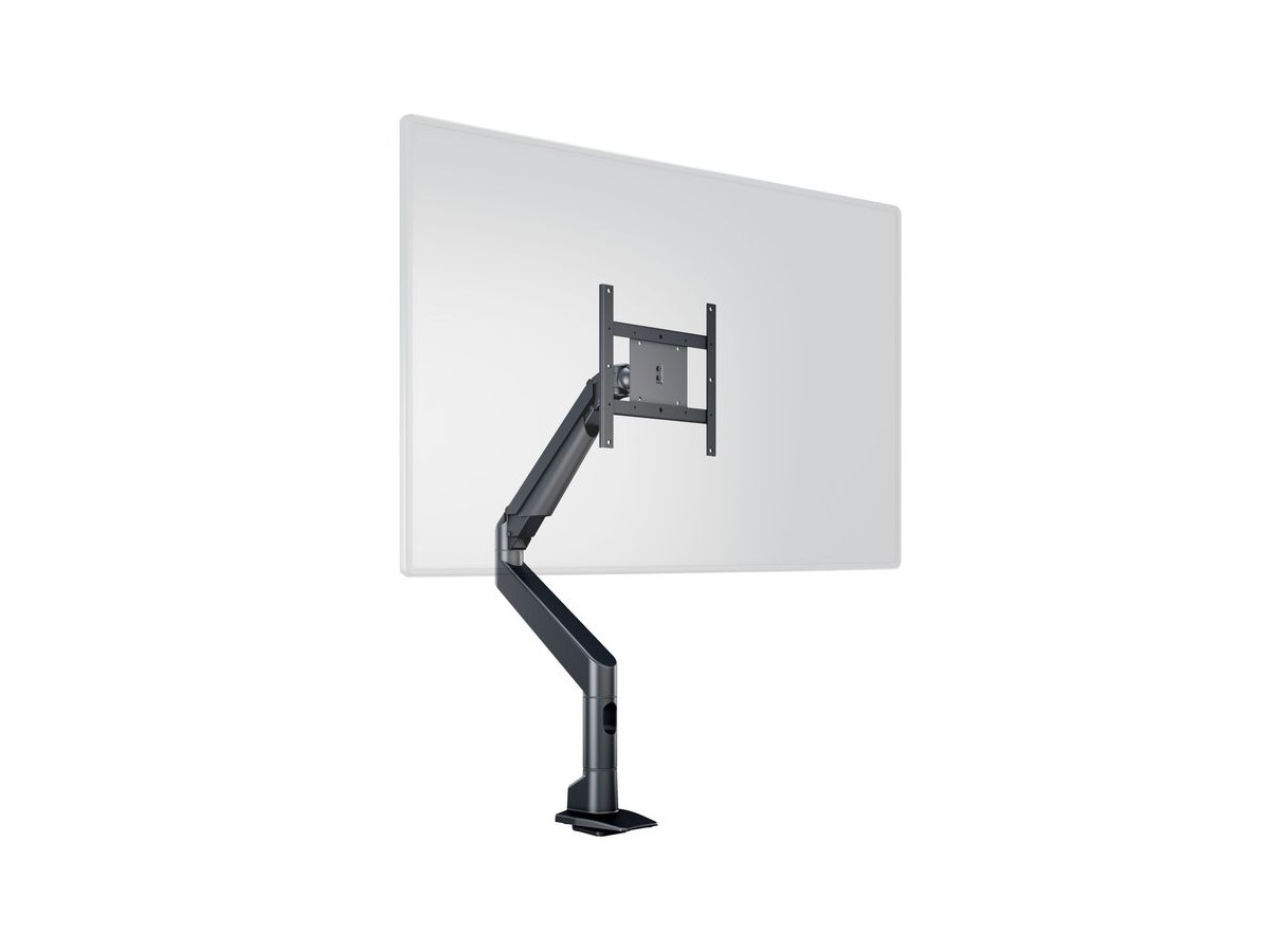 The M VESA Gas Lift XL Single Black is made out of a durable aluminum construction and uses a gas driven suspension technique. This makes the screen "float" and it can then be moved with near zero effort. Sleek and streamlined, the M VESA Gas Lift XL Single Black frees up space and allows positioning of your display for greater productivity. With a maxload of up to 10kg even very big monitors can be used. The height clearance is 615 mm above the desk. Rotation function is not used for widescreen or ultrawide screen monitors. The unique counterbalance gas technology provides smooth adjustment in any direction. Easy move the screen from landscape to portrait position or move the screen close to the desk, high up, matching almost any wanted working position imaginable.