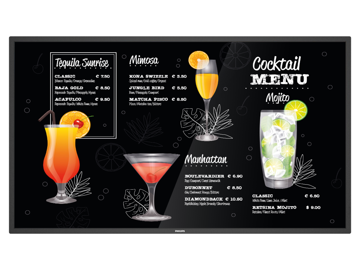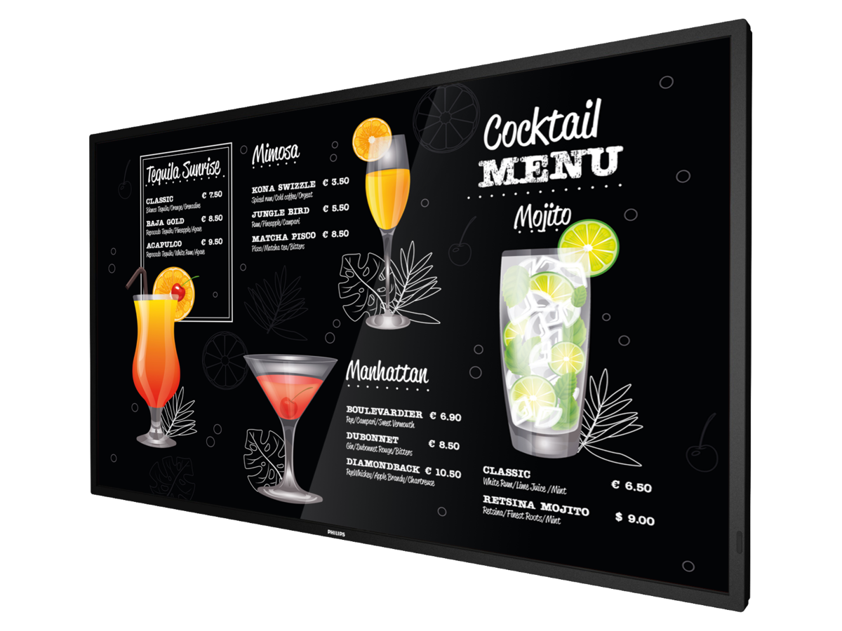 Product code:Made for 24/7 operation, the robust Philips P-Line digital signage display stands the test of time. Clear UHD picture quality and high brightness make it perfect for demanding environments such as retail, transportation, and food and drink.